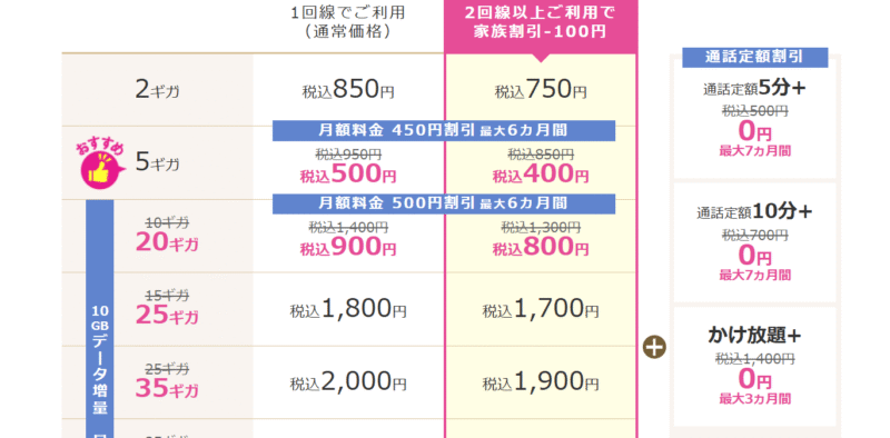 ①5GB/月の音声付額料金が6ヶ月間450円引きで税込み500円